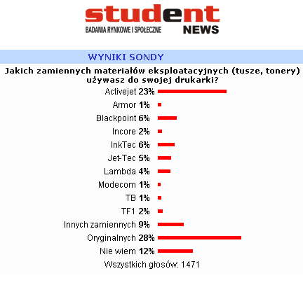 W roku 2009 najbardziej popularną marką tanich tuszy i tonerów (tzw. zamienników) jest nadal Active Jet. To właśnie produkty Actice Jet sa uzywane przez studentów najczęściej do swoich drukarek. "Dziwne", że także oryginalne tusze i tonery ciesza się dużą popoularnością mimo wysokich cen. Mozna więc zaoszczędzić (a mamy kryzys) i wybrac tani i jakościowy zamiennik do swojej drukarki, zamiast drukować "oryginał".