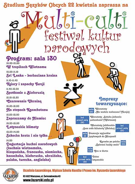 22 kwietnia o godz. 10.00 zapraszamy na Uczelnię Łazarskiego, Aula nr 130. W tym dniu odbędzie się szalony, pełen przyjaźni, dobrego jadła, warsztatów i wyśmienitej zabawy festiwal kultur narodowych Multi-culti. Wielokulturowa społeczność Uczelni to bogactwo, które warto poznać...