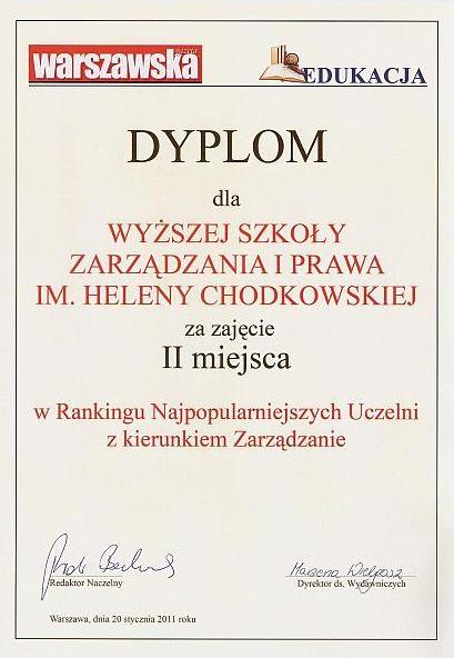 Wyższa Szkoła Zarządzania i Prawa im. Heleny Chodkowskiej w Warszawie znalazła się na II miejscu w Rankingu Najpopularniejszych Uczelni z kierunkiem Zarządzanie. Ranking powstał przy współpracy Centrum Badań Społeczno-Finansowych i tygodnika „Warszawska Gazeta”. Jest wynikiem ankiety przeprowadzonej wśród tegorocznych maturzystów.