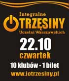W czwartek 22 października w 11 warszawskich klubach odbędą się Integralne Otrzęsiny Uczelni Warszawskich. Na wszystkie imprezy będzie obowiązywał jeden bilet, dający prawo wstępu do wszystkich klubów bez ograniczeń.