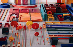Jakkolwiek malarz jest oszczędny w rozgrywkach barwnych, płasko kładziony kolor jego obrazów jest optycznie żywy. Oko widza przyciąga wybór ciepłej w tonach palety. Z modułów czterech podstawowych figur geometrycznych: