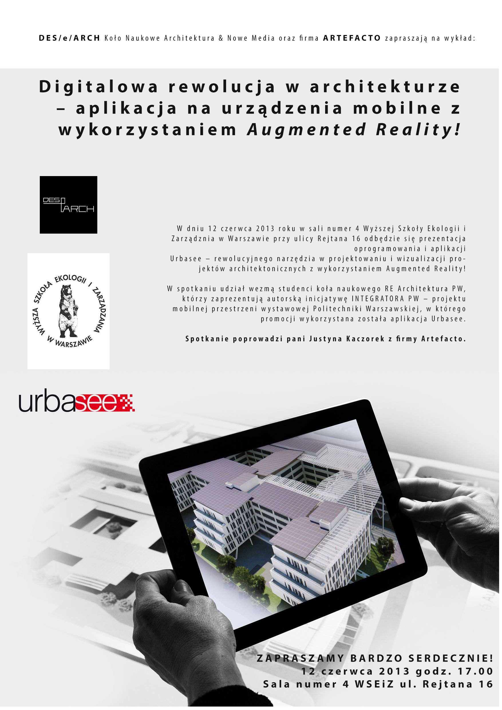 W dniu 12.06.2013 r. w Wyższej Szkole Ekologii i Zarządzania w Warszawie przy ul. Rejtana 16 w sali nr 4 o godz. 17.00 odbędzie się otwarty wykład pt. „Digitalowa rewolucja w architekturze – aplikacja na urządzenia mobilne z wykorzystaniem Augmented Reality!”, w czasie którego Pani Justyna Kaczorek z firmy Artefacto zaprezentuje oprogramowanie i aplikację Urbasee – rewolucyjne narzędzie w projektowaniu i wizualizacji projektów architektonicznych. Organizatorami wykładu są DES/e/ARCH Koło Naukowe Architektura & Nowe Media WSEiZ oraz firma Artefacto.