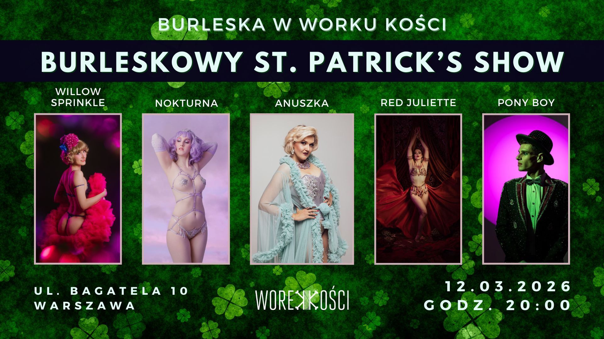 Zapraszamy na zielone, wysokoprocentowe show burleskowe! Na scenie: Red Juliette, Willow Sprinkle, Pony Boy i Nokturna.
