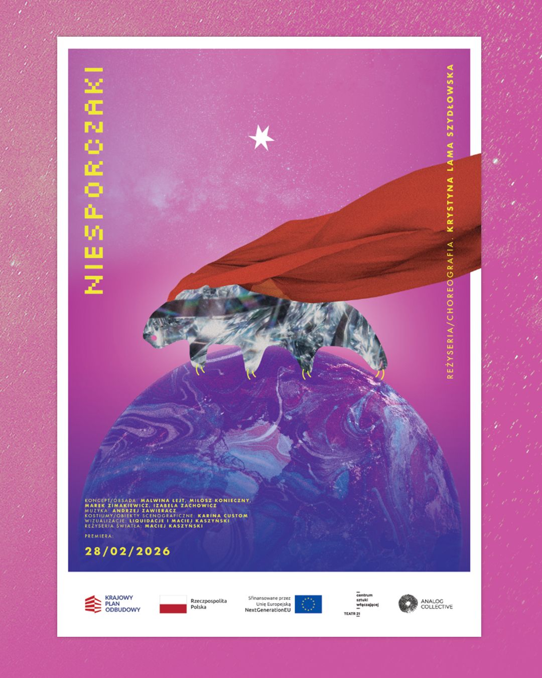 Premiera powstała w ramach projektu „Produkcja spektaklu „Niesporczaki” oraz rozwój cyfrowych kompetencji fundacji Analog”, który jest finansowany ze środków Unii Europejskiej – Funduszu Odbudowy i Zwiększania Odporności (NextGenerationEU) w ramach Krajowego Planu Odbudowy i Zwiększania Odporności.”
