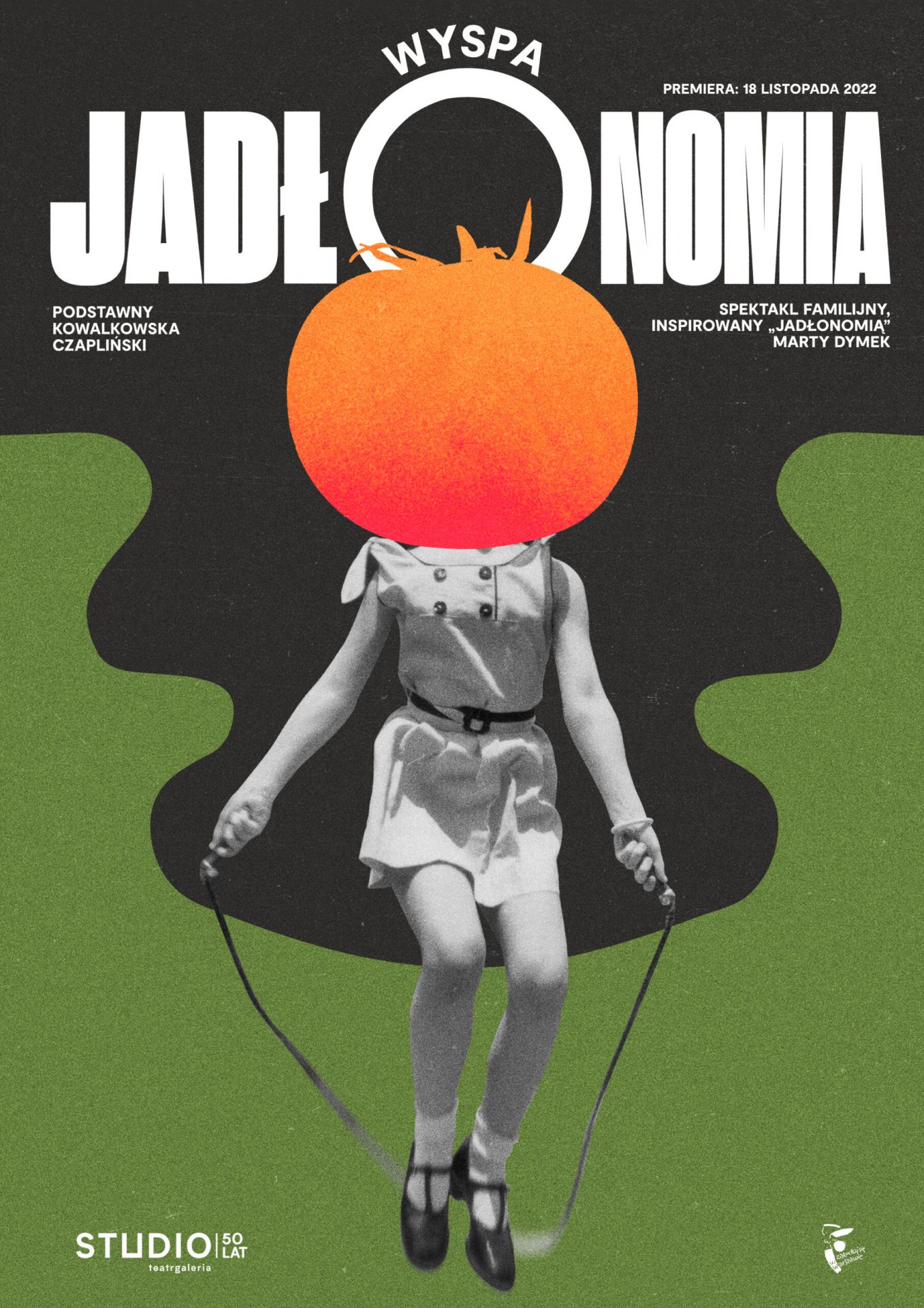 „Wyspa Jadłonomia” to kulinarno-podróżniczo-kryminalno-rewolucyjny spektakl dla dzieci i młodzieży inspirowany „Jadłonomią” – cyklem popularnych książek kucharskich Marty Dymek oraz propagowaną przez autorkę filozofią roślinnego gotowania. To przedstawienie, które zachęca do zielonego aktywizmu w obszarze własnego talerza i własnego świata.Bohaterką przygodowo-sensacyjnej opowieści, czerpiącej z tradycji japońskich filmów anime, jest dziewczynka M., która mierzy się z groźnym potworem, czernią, która zagraża całemu światu, zwłaszcza zaś dorosłym. Gdy potwór pojawia się w życiu bohaterki, nic nie pozostaje takie jak było. Stawką staje się życie i zdrowie najbliższych. Czy dziewczynka znajdzie tajemną recepturę uzdrowienia świata? Kogo spotka na Wyspie, na którą porwie ją tajemnicza siła? I czy uda jej się wrócić do domu? Jak skończy się spotkanie z Wiedźmą Jadłonomią, siłą, która wie wszystko? Czy dziewczynka zechce być bohaterką idei zielonej rewolucji? A jeśli tak, to czy inni ludzie pomogą jej uzdrowić świat, dokonać zmiany za pomocą łyżki, widelca, listy zakupów i przeformułowania filozofii życia? Są takie chwile, kiedy niebezpieczeństwo, które grozi najbliższym, każe przedefiniować myślenie o rzeczywistości. W awangardzie zielonej rewolucji twórcy spektaklu widzą dzieci i młodych ludzi, którzy dorastają właśnie do odpowiedzialności, od której uchylili się ich rodzice.„Wyspa Jadłonomia” to spektakl o zmianie myślenia. Ale ponieważ samo myślenie nie wystarczy również o potrzebie działania. Pełne humoru i grozy, zwrotów akcji i gorzkiego śmiechu przedstawienie, zaprasza do świata, w którym z dziećmi i młodzieżą rozmawia się poważnie, bez udawania, że świat jest lepszy niż jest. Komiksowa opowieść o małej rewolucjonistce zachęca do wspólnej refleksji dzieci i dorosłych – refleksji o tym, co można zrobić na co dzień, by żyć zdrowiej, odpowiedzialniej i z myślą o lepszej przyszłości planety, ludzi i nie-ludzkich istot. Spektakl o odpowiedzialnym jedzeniu stawia widzów przed wspólnym wyzwaniem troski o świat, który wymaga leczenia i natychmiastowej interwencji ekologicznej, etycznej, a również kulinarnej.„Wyspa Jadłonomia” to kolejne przedstawienie realizowane przez Macieja Podstawnego i Dorotę Kowalkowską z myślą o wzmacnianiu dziecięcej i nastoletniej sprawczości oraz potrzebie międzypokoleniowej edukacji przez teatr. Poprzednie spektakle zrealizowane przez ten zespół, „Greta i Ostatni Wieloryb” czy „Królowa Śniegu”, zyskały uznanie widzów i wiele nagród związanych ze sztuką dla młodzieży. Tym razem duet twórców zaprosił do współpracy nad scenariuszem dramatopisarza Jana Czaplińskiego. Wśród inspiracji można wymienić oczywiście i przede wszystkim serię „Jadłonomia” Marty Dymek, ale również „Alicję w Krainie Czarów”, „Spirited Away”, czy „W krainie bogów” Hayao Miyazakiego.Spektakl dedykowany dla dzieci od 10 roku życia.