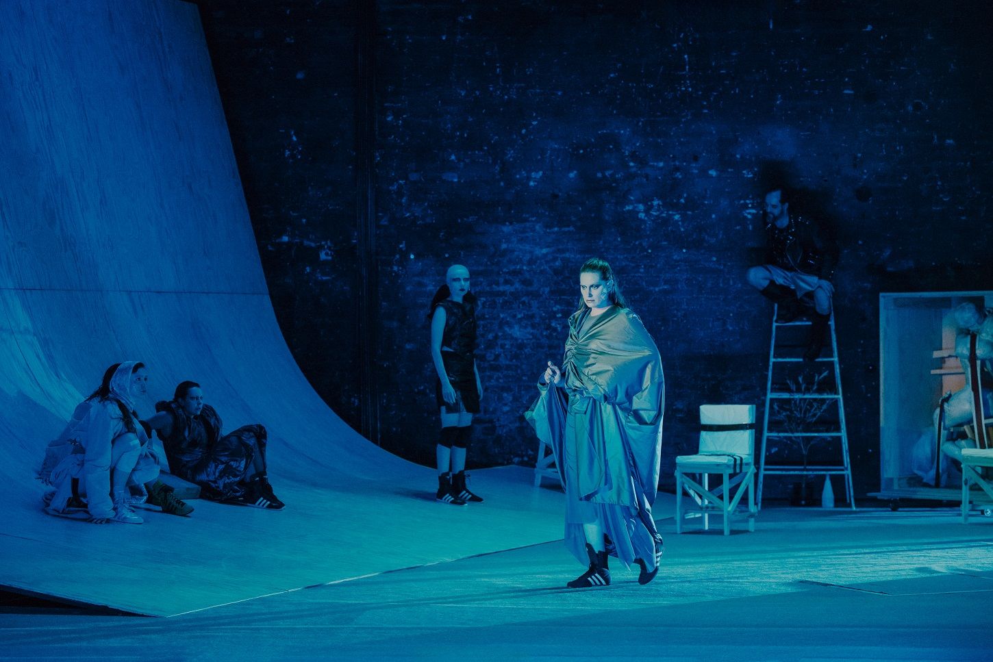 Spektakl budowany jest przez ciało i muzykę graną na żywo. Ruch, napięcie, drżenie i rytm stają się głównym językiem sceny. Twórcy sięgają po techniki tańca współczesnego i praktyki TRE, redefiniując antyczny chór. To teatr intensywny, fizyczny i bezlitosny w diagnozie świata, który odrzucił bogów, ale nie porzucił wojny.