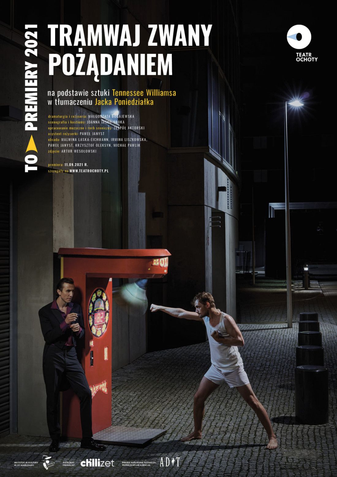„Tramwaj zwany pożądaniem” – pozornie prosta, niemal mieszczańska historia o „wystarczająco” szczęśliwym młodym małżeństwie i siostrze żony, której przyjazd uruchamia całą lawinę skrywanych pretensji, niezaspokojonych ambicji i tłumionych seksualności. Tragedia rodząca się z rzeczy i zdarzeń tak zwyczajnych, że wydają się przynależeć do jakiegoś rytualnego porządku świata. Wstrząsające studium rządzących nami stereotypów. Co przerażające, mimo upływu ponad 70 lat, tak niewiele się zmieniło.Rytuały codzienności – rytuały oceniania siebie i innych, miara szczęścia, jaką sobie i innym przykładamy – dom, mąż, żona, dzieci, udana praca, pieniądze, miejsce w rzeczywistości które zajmujemy, miejsce na społecznej drabinie. Czy od schematów rzeczywistości można uciec? Czy w końcu można stworzyć jakąś inną nowa rzeczywistość, bez przemocowo-seksistowskiego schematu myślenia i działania, bez wyznaczania ról kobietom – wpychania ich w role tych posłusznych, pruderyjnych, grzecznych, tworzących dom; bez wyznaczania ról mężczyzn na tych zarabiających i silnych? Jak to się dzieje, że kiedy już wydaje się, że świat się zmienia, na nowo wpadamy w piekło stereotypów? Dlaczego wciąż na nowo tłumaczymy rzeczy wydawałoby się oczywiste?Teksty Williamsa outsidera, homoseksualisty niepogodzonego ani z rolami społecznymi, ani z własną rodziną, pokazują piekło schematów. Młody zespół aktorski Teatru Ochoty mierzy się z piekłem Williamsa, próbuje, testuje jak i gdzie uciec ze stereotypów, sprawdza dlaczego, wpadamy ciągle w te same mielizny.