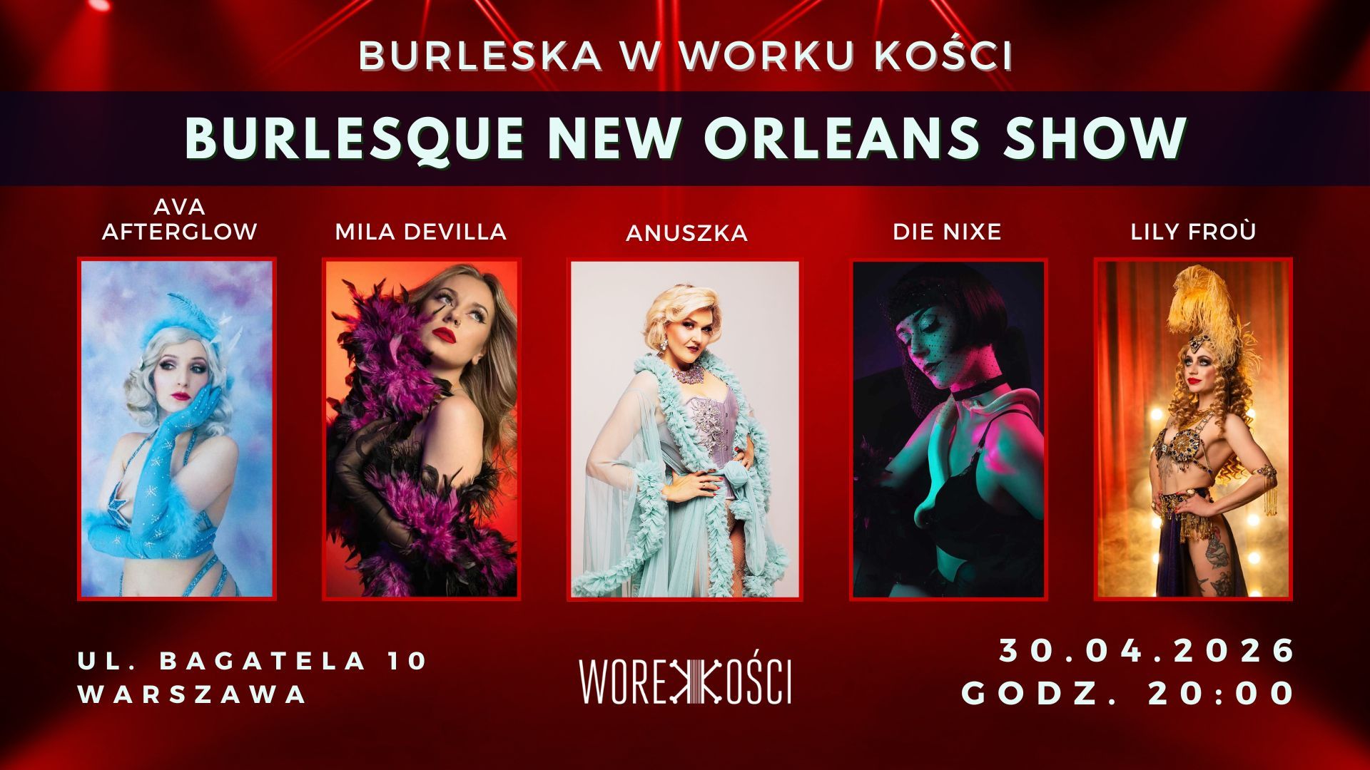 W burleskowym spektaklu wystąpią: Mila DeVilla, Die NIxe, Lily Froù i Ava Afterglow.